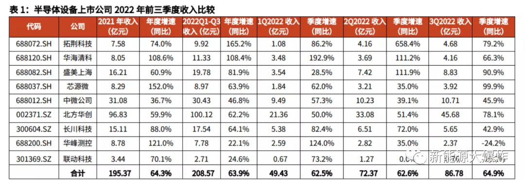 今年前三季度,国内主要半导体设备上市公司(北方华创、中微、长川、拓荆、 华海清科、芯源微、盛美、华峰测控、联动科技,下同)总收入 209 亿元,超 过 2021 年全年行业收入 195 亿元,同比增长 64%。