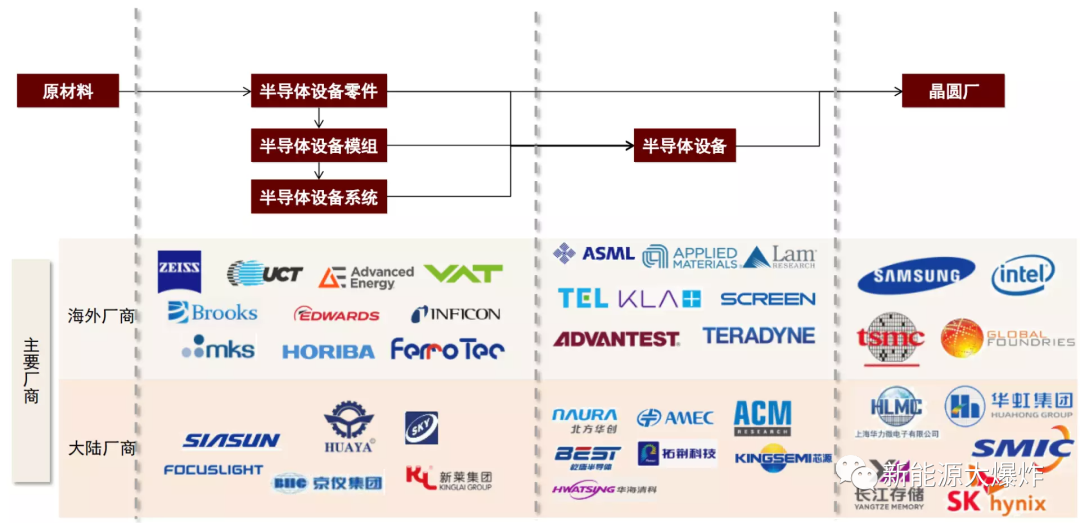半导体设备零部件在半导体行业中属于行业上游,但在半导体设备行业又属于行业中有,上游是各种原材料公司,下游则是半导体设备厂商,以及晶圆厂商。