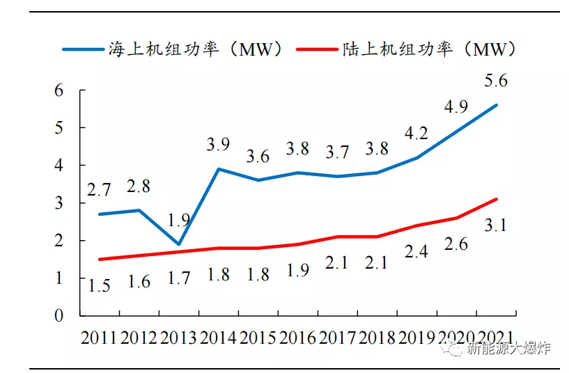 根据 CWEA 的数据统计:2021 年海风与陆风的机组平均功率分别达到了 5.6MW 与3.1MW,风机大型化趋势非常明显,而且趋势还在继续。