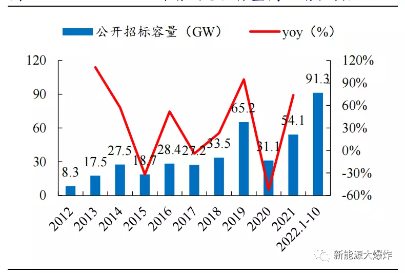 虽然今年下半年风电抢装不及预期,但招标量却大超预期,截至 2022 年 10 月,根据中国招投标公共服务平台的不完全统计,2022 年风电累计招标量已经达到了 93.1GW,全年累计招标量有望超 100GW。