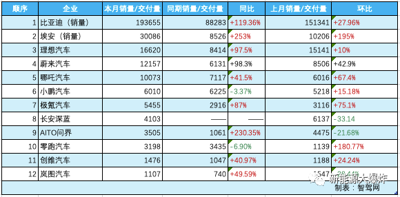 跟小鹏一样,榜单里唯二在2月份销量同比下滑的是零跑汽车,甚至下滑的更多,不成器呀,零跑!2月份交付了3198辆,同比下滑6.9%,不过由于1月份实在太拉垮,环比增速还是好看的,增幅仅次于埃安,惊不惊喜意不意外?
