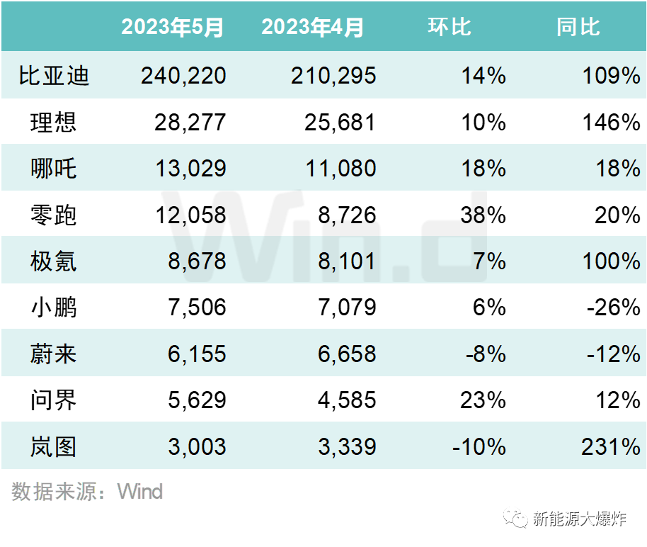 很明显,比亚迪继续一骑绝尘,5月新能源汽车销量240220辆,同比增长109%,不得不夸一句,比亚迪的效率是越来越高了,从最开始的每月3号数据才能出来,后面变成2号出来,现在也能跟着其他厂商1号出数据了。