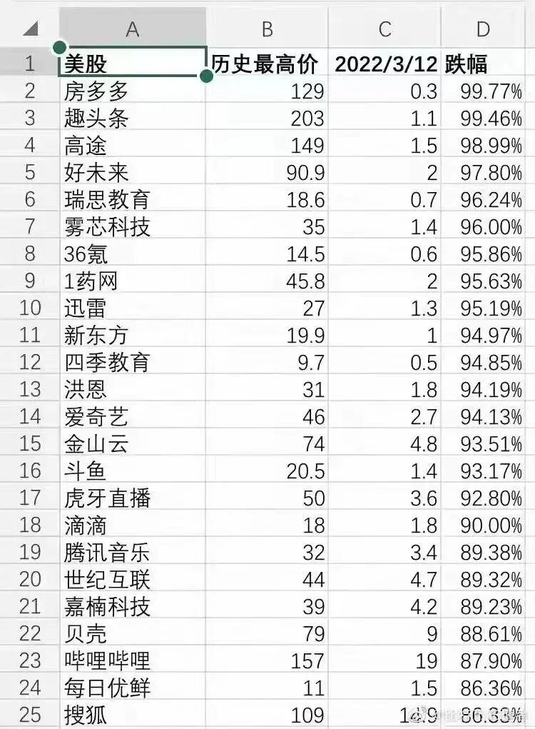 前几天有网友总结了一份美股中概股距离历史最高价的跌幅图。