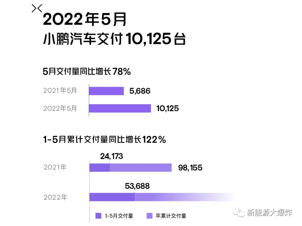 5月总交付量10,125台,同比增长78%。其中,小鹏P7交付4,224台,小鹏P5交付3,686台,小鹏G3i交付2,215台。今年1-5月小鹏汽车累计交付53,688台,同比增长122%。