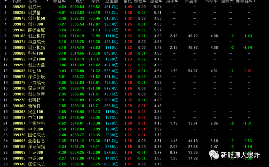 今天的市场有多惨,尤其是新能源板块有多惨,应该不用leo多讲吧,只要有看盘的小伙伴都知道:哀鸿遍野,惨遭血洗,残暴至极,要多惨有多惨,看两张图更是胜过千言万语。