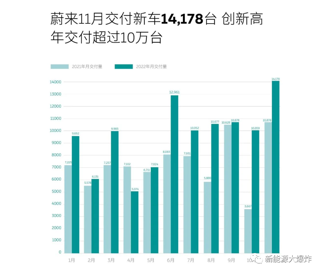 11月份,蔚来汽车交付新车14,178辆,环比增长40.9%,再创当月交付历史新高,连续五个月交付量破万。