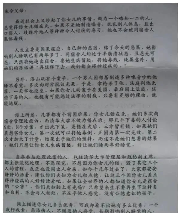 2013年,朱令的父亲收到了一封匿名信,称会发生这样的事都是因为朱令的个人习惯不好,影响室友休息,3名室友忍无可忍才会给她下毒。