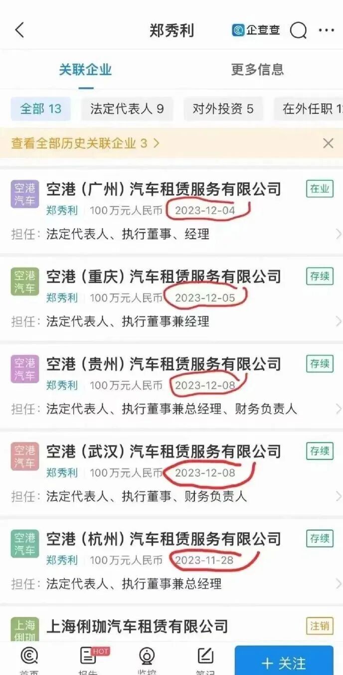 据企查查APP显示,该公司成立于1996年,注册资本5000万元人民币,实控人为郑秀利,其名下关联企业共有13家,并在9家企业中担任法定代表人,多为汽车租赁公司,分布于重庆、贵州、武汉等地。