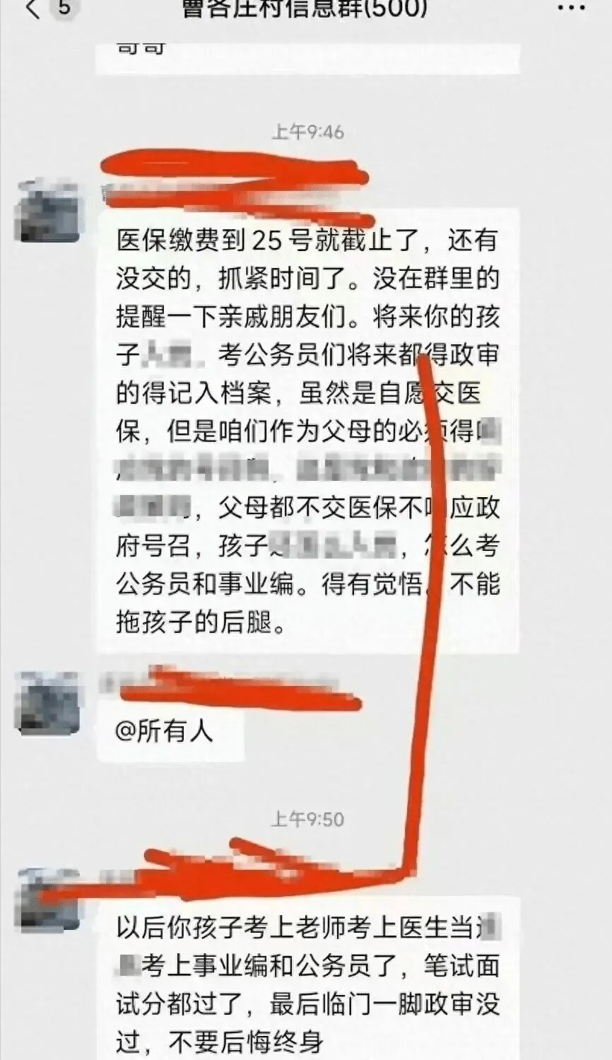 “父母都不交医保,孩子还怎么考公务员和事业编……” ,为了催村民交医保,工作人员用孩子未来的铁饭碗来威胁。