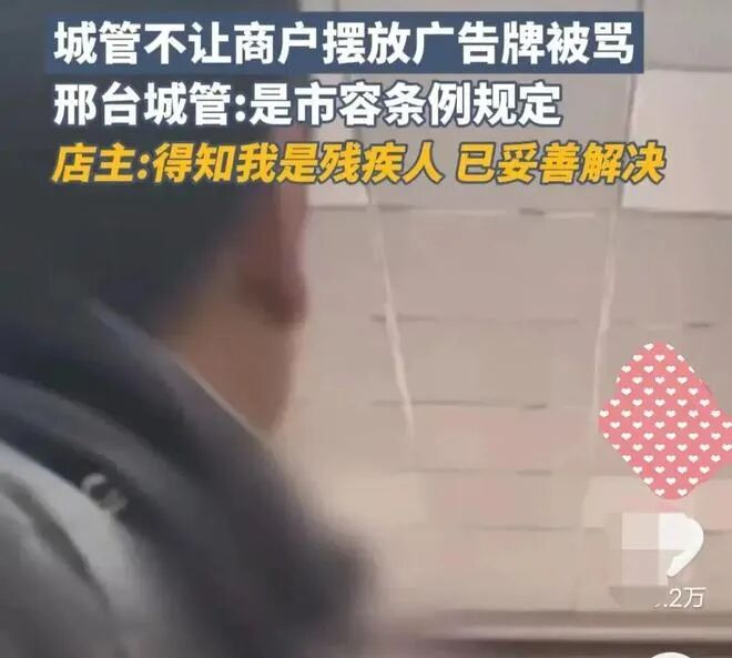 1月5日,有网友在网上曝光了一则刑台城管想撤商户广告,和商户发生争执的视频, 城管不让商户在外面摆广告牌,于是双方就发生了争吵。