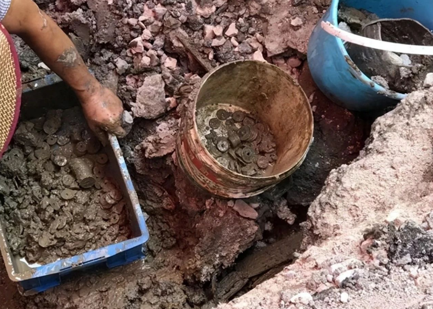 他们小心翼翼地挖掘后,发现是一堆被泥土包裹的古物。这些古物包括青铜器、瓷器,尤其是大量古铜币。