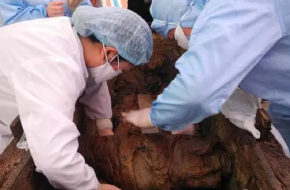 墓室里的挖掘考察工作进行时,负责棺木的专家们小心翼翼地揭开了棺盖,发现里面的尸骨和衣物仍然紧密连接在一起。
