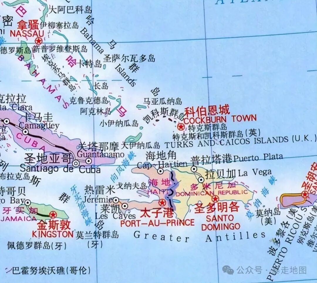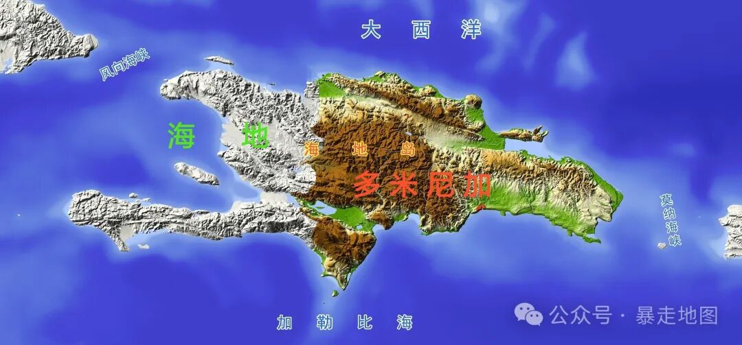 海地岛东西长约650公里,南北宽约240公里,面积约7.6万平方公里,还没我国重庆市大。就是这么一个小岛,还分成了两个国家,一个是海地共和国,一个是多米尼加共和国。