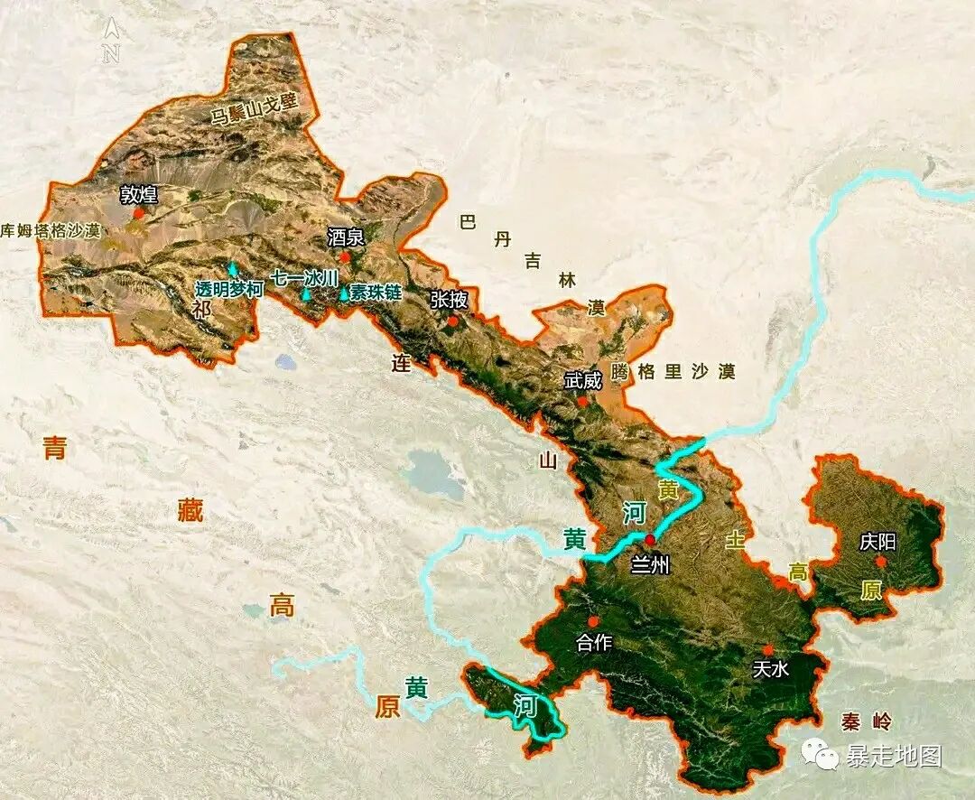 甘肃南与青海以祁连山为界,北和内蒙古以北山为界,两山之间狭窄地带就是河西走廊,从乌鞘岭一直延伸到玉门关,长达一千多公里,元朝时甘肃设省就是甘肃省的主体,之后的朝代又把和陕北更接近的庆阳、平凉,以及和关中同俗的天水、陇南等一并划入甘肃,形成“犬牙交错”,最终变成了今天的模样!