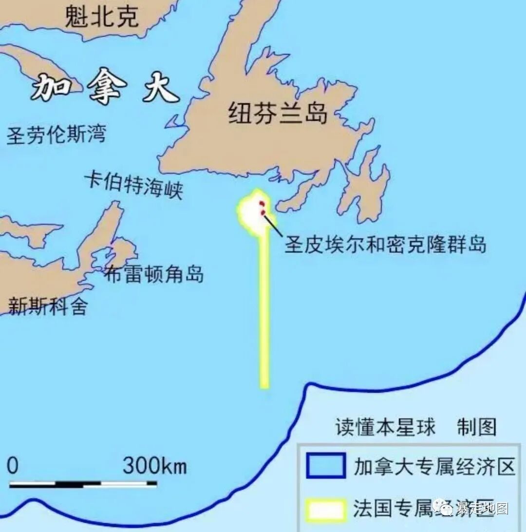 位于北美洲加拿大纽芬兰岛以南25公里的北大西洋中,全境由圣皮埃尔、密克隆、朗格拉德等八个岛屿组成,面积242平方千米,人口0.63万,主要为法国移民后裔,官方语言为法语。