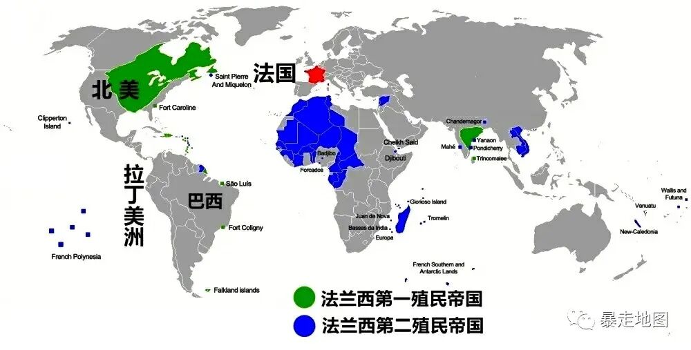 法国55万平方公里的土地算不上领土大国,非洲很多国家都比法国大,在欧洲仅能排名第三,在全球也排在四十名开外了!然而,法国人眼中的法国可不只有欧洲本土这么大,比我们看到的要大的多了,大多少呢?地跨六大洲,超过100万平方公里!