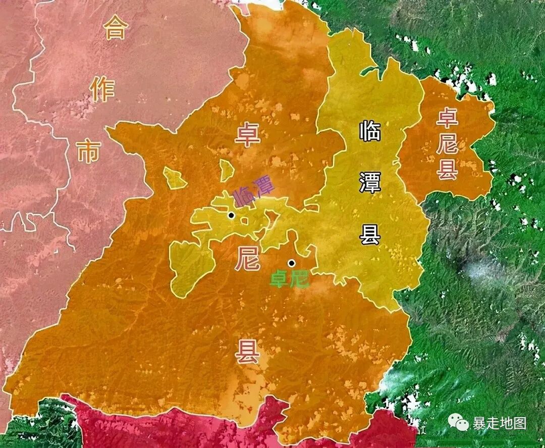 卓尼县在南、西、北三个方向均将临潭县包围,东部还有一片比较大的飞地。而临潭县土地曲折深入卓尼县内部,就连县城也深入卓尼腹地,这条纵深的土地里还有卓尼县的两小块飞地,而在卓尼县境内西北部还有两块地方属于临潭县,真正的唇齿相依。