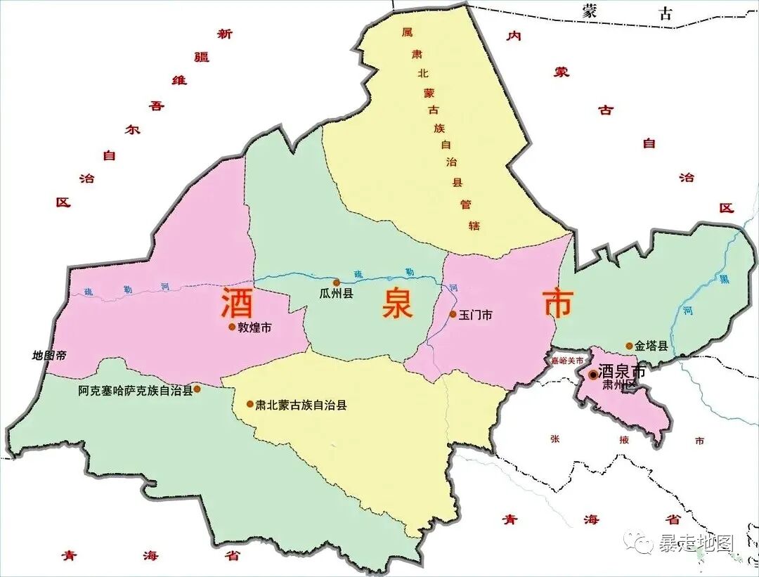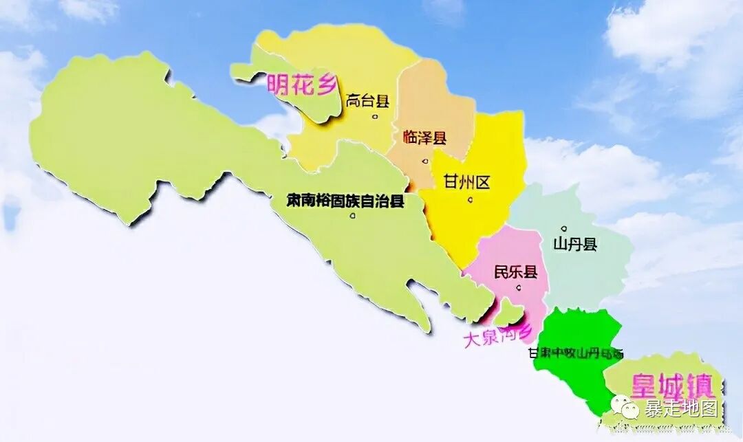 肃南县地图比较奇特,由四块互不相连的土地构成,除了主体,还有三块飞地分布于周围。一个是位于高台县西部明花乡,一个是位于民乐县南部大泉沟乡,还有最远的一个位于山丹县南部皇城镇。