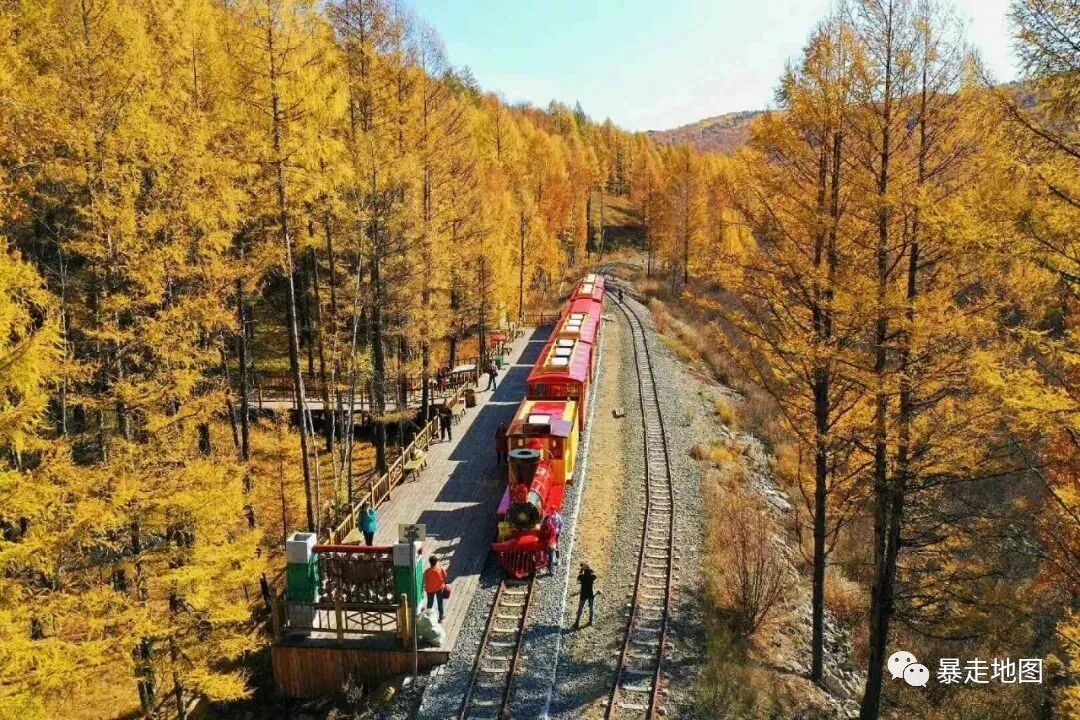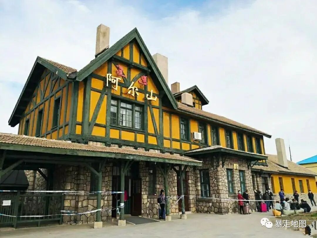 乌兰浩特每天有两班火车到达这里,车程四个小时左右,自驾的话从与乌兰浩特沿着307国道一路向西北,穿过秋天的大兴安岭,路两边都是茫茫林海,层林尽染,金黄火红的树叶交错在青山绿水间,将阿尔山的秋天渲染成童话般的世界。沿途路过的几个小镇,宁静纯朴,很多房子都是木头搭建,原始自然,很有林区特色。