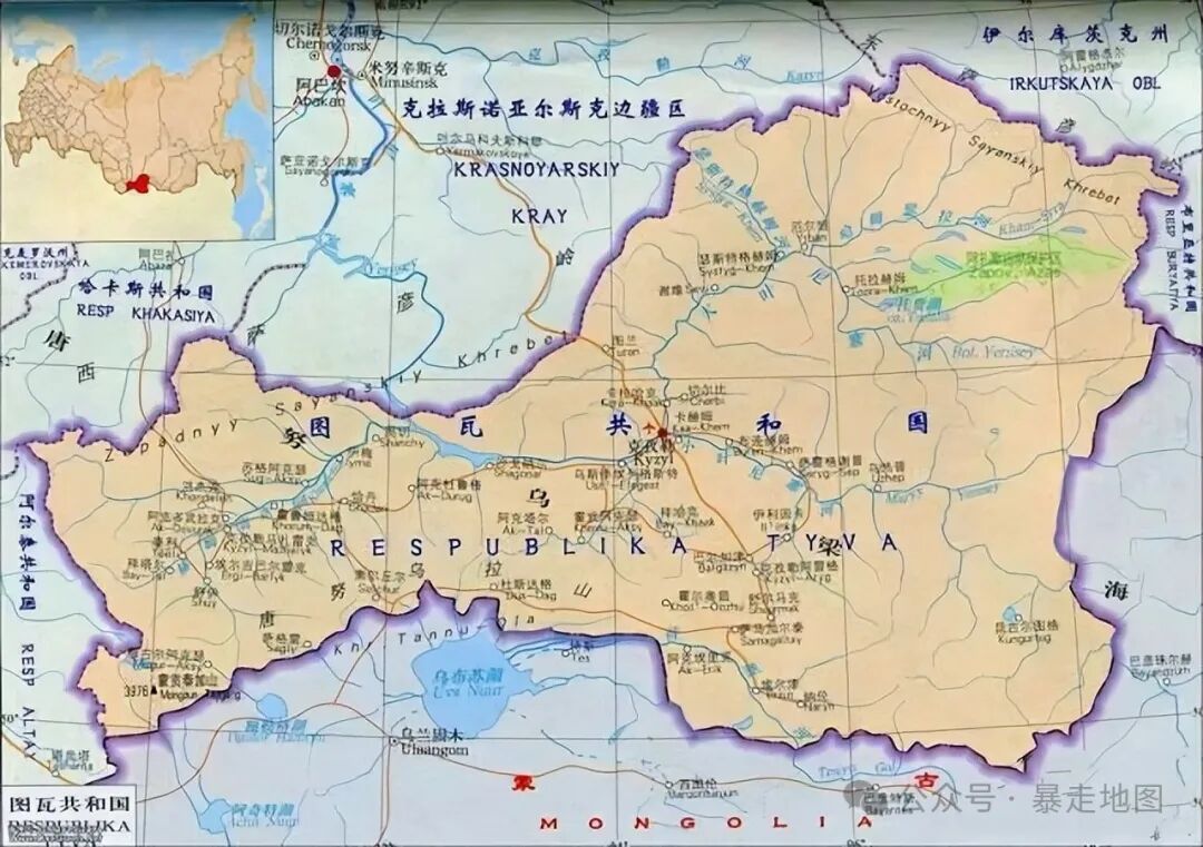 唐努乌梁海位于外蒙古的西北,北至萨彦岭,南到唐努乌拉山,是一个群山环抱的盆地,东西长约900公里,南北宽约600公里,面积16.86万平方公里,相当于河南省的大小了,是一片很辽阔的土地,如今在行政上属于俄罗斯的图瓦共和国。
