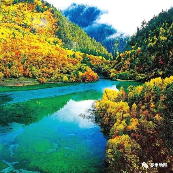 九寨沟沟中雪峰林立,林木茂密,水池浅滩五彩斑斓,晶莹的溪水穿行于森林和浅滩之间,各种颜色重叠交错,犹如被上帝打翻了调色盘。