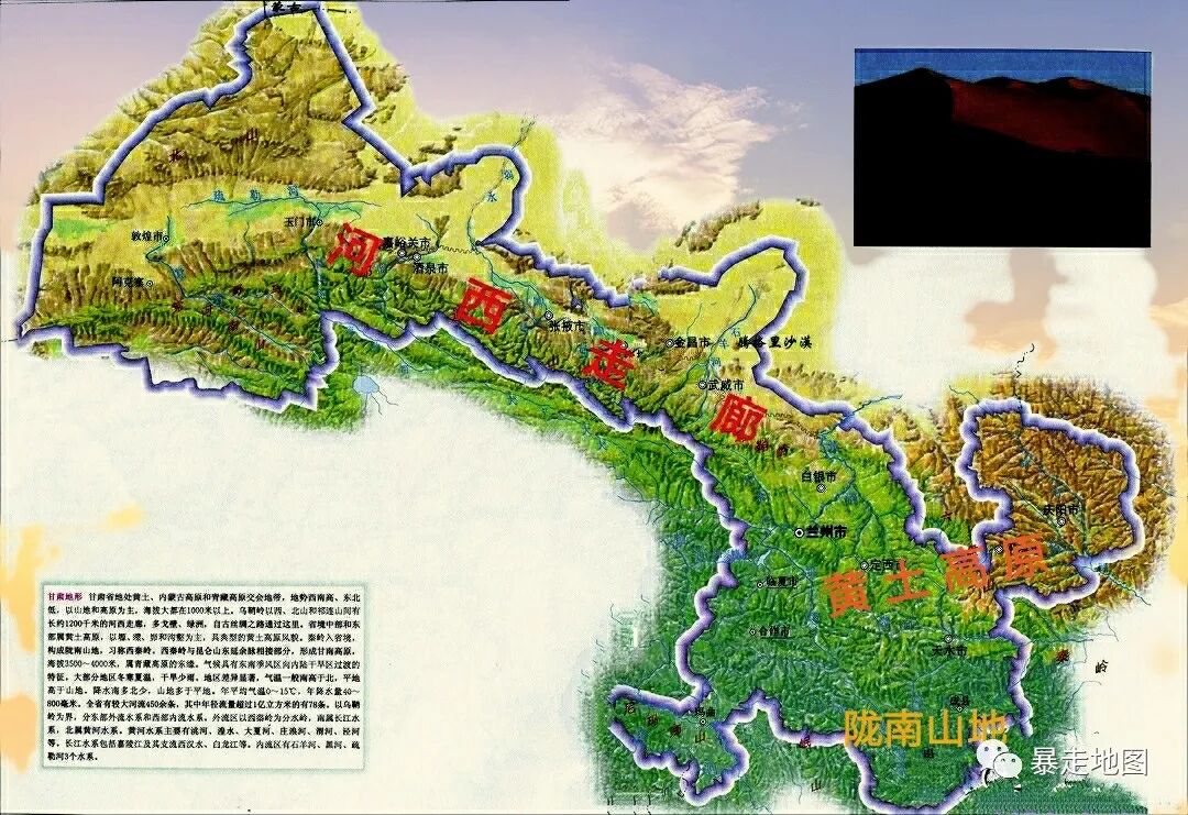 甘肃是西北五省区之一,甘肃省的版图尤为奇特,形状像一个哑铃,又如同一柄巨大的“玉如意”斜贯在西北边陲。