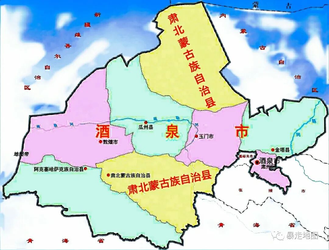另一块被瓜州、玉门与主体隔开,成为一块飞地,面积约3.1万平方公里,南北两块土地距离约180公里。大部分人口聚居在南部,飞地马鬃山镇人口只有不到2000人。