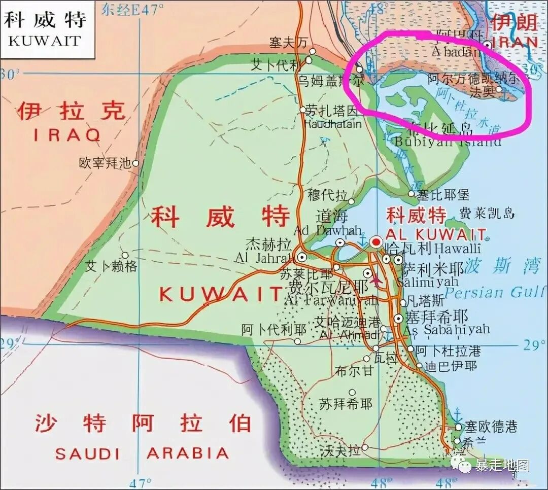 伊拉克的海岸线被伊朗和科威特挤得只剩下波斯湾北岸60公里,虽说也不算太短,但环境实在不理想,海岸上都是滩涂,根本没有建设港口的条件,更憋屈的是,还被科威特的几个小岛给堵住了一大截,把伊拉克出海口牢牢堵住,连修建一座港口的地方都没有,俨然成了内陆国。