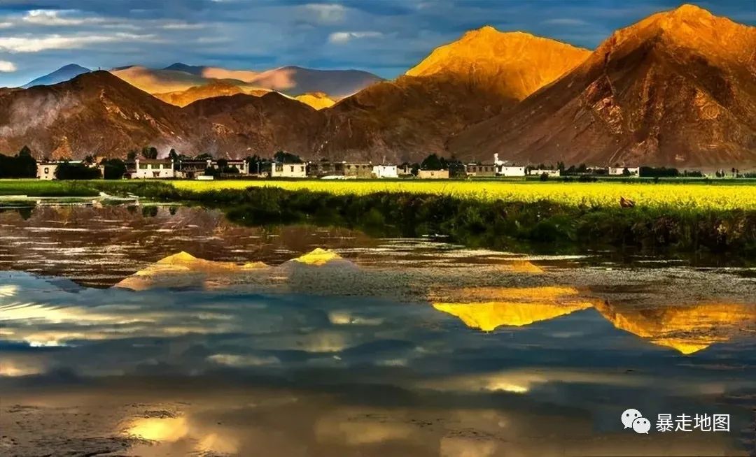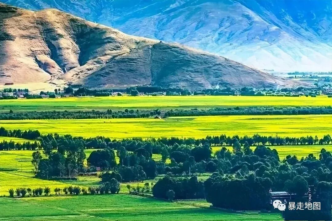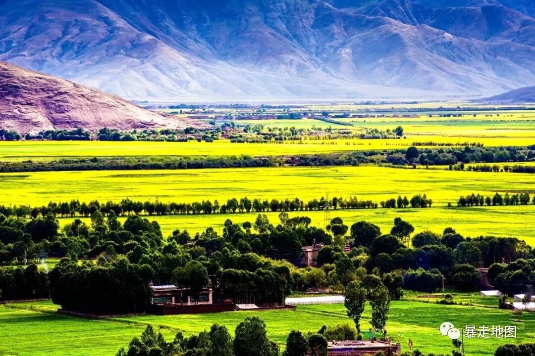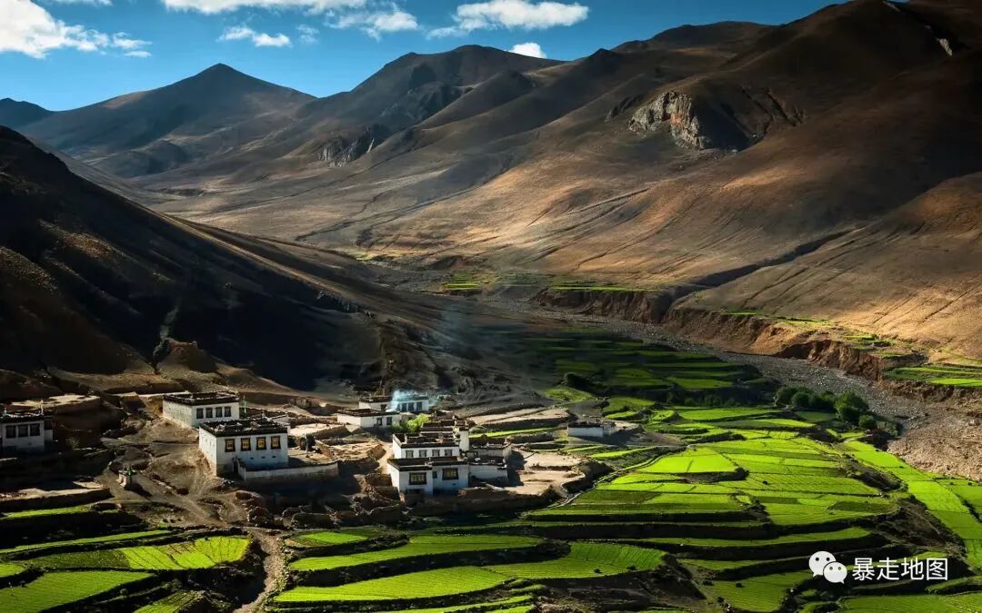 这里是一片欢腾的西藏小江南:满山满野的苍翠欲滴,山顶云雾蒸腾,山谷农田青黄相间,应和着高山垂挂的瀑布,谷底浅吟的潺潺水流,加上点缀其间的藏式民居,不是江南却胜似江南!