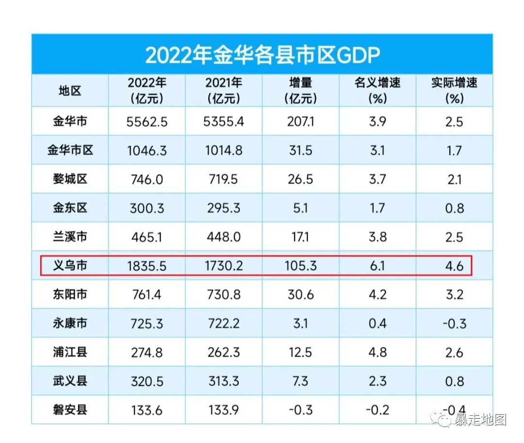 义乌2022年的GDP为1835.5亿元,位居金华各区县之首,在金华的9个区县中遥遥领先,约是排名第二的婺城区的2倍还多,金华市区由婺城区、金东区组成,它们2022年的GDP合计为1046.3亿元,还不到义乌的三分之二。
