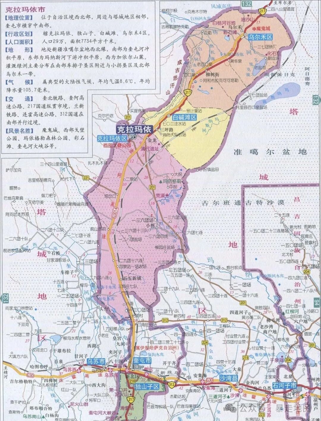 克拉玛依市位于新疆西北,南依天山,东靠古尔班通古特沙漠,辖四个市辖区,全市总面积7733平方公里,总人口约49万!