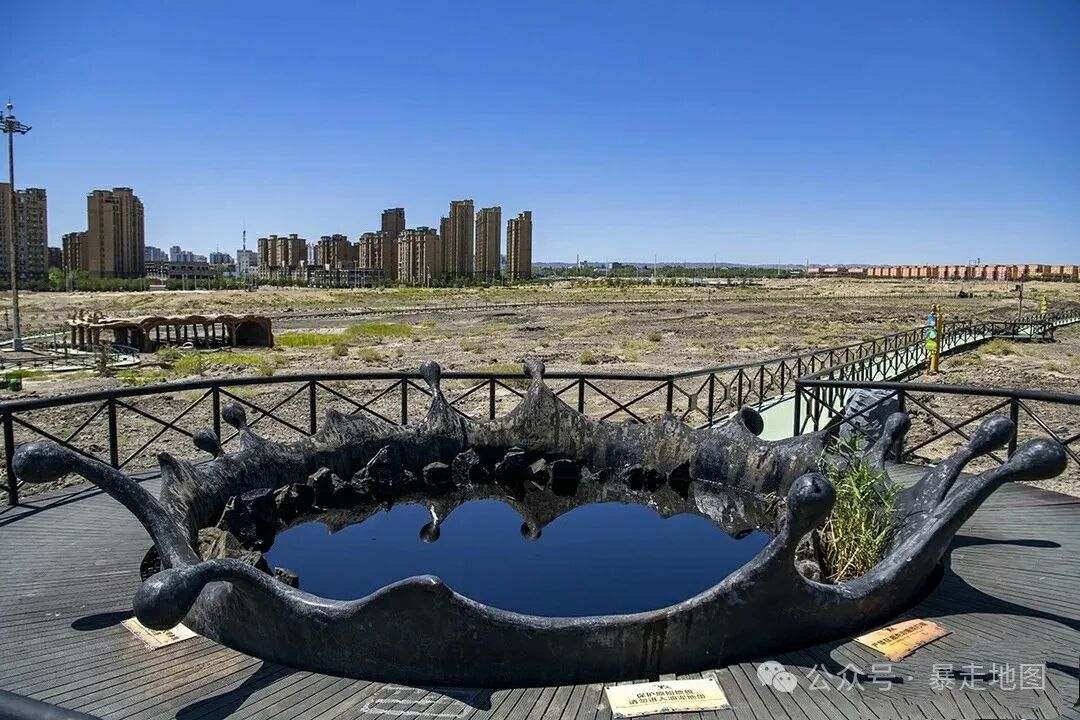 距市中心2公里的黑油山,是克拉玛依油田油苗露头的地方;埋藏地下亿万年的石油受地层压力影响,沿着裂隙不断向地表渗出,经年累月的积累凝结成一群沥青丘,最高的达13米。