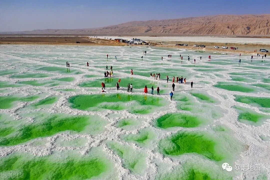 风平浪静时,湖泊宛若镜面般散布在四处,颜色纯美剔透,淡青、翠绿、深绿的湖水如同镶嵌在戈壁上的翠玉一般,翠绿碧透的湖水再搭上莹白如玉的盐花,在蓝天白云衬托下,更加美艳。