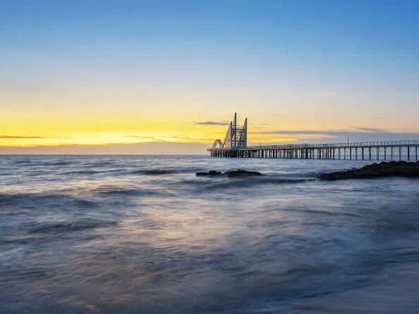 此外,再推荐一个更小众的日落观赏点:金月湾椰海小镇。在海上礼堂看日落,氛围感拉满。