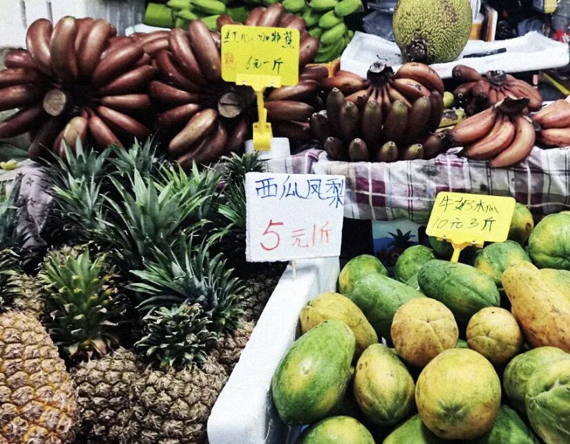 由于这里有海南最大的农作物基地,所以蔬果价格相比海口或三亚更为便宜,2块钱买1斤红心火龙果,10块钱能买3斤木瓜(春节期间物价可能有所上涨)