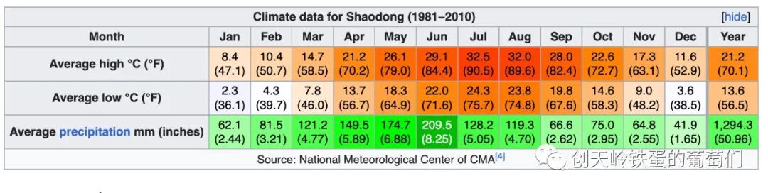 到这儿,欧洲葡萄品种基本上已经跟甲州与湖南山区说再见了。照理说,我这山坡上的葡萄们每年夏天都得让霉菌们扒层皮,而事实上经我多年种植发现并没有,我家山坡够高,夏天明显体感比山下凉爽,风也更多,因此我的葡萄园所在气候应该略优于邵东县的纸面数据。