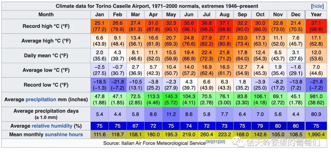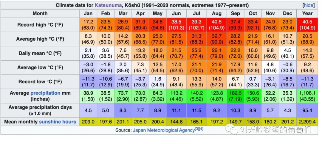 皮埃蒙特在这些指标上,都是无敌的。光看它没意思,要有对比才知道伤害,下表是日本山梨县甲州市胜沼町的气象历史信息:
