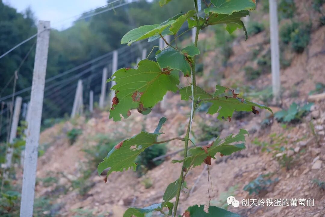 这叶片上火红的斑块,都是霜霉病晚期留下的残局。稚嫩的葡萄苗们从潮湿的春夏过来安然无恙,谁也没想到却在秋天染了这妖艳的病。好在天气越来越凉,今年这局,随着气温下降将会快快结束。