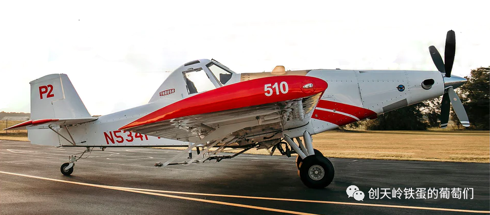 这是一架美国产的 Thrush 510 型农用飞机,专门喷农药的,是历史上最成功喷药飞机之一。起飞极限可以装载1930升农药水剂,工作速度240公里/小时。也就是说,它以最大工作速度从天上这么一扫过去,只需要一秒钟,就喷完了一亩地。