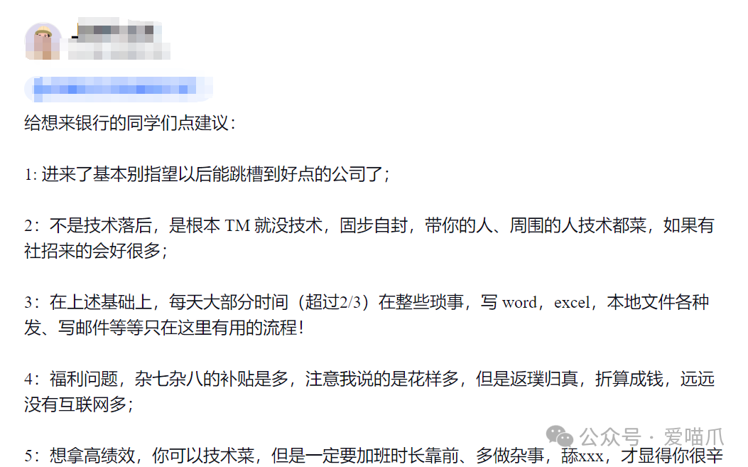 该网友提出银行工作限制大,不易跳槽至更优质企业,科技进步较慢,甚至可能需要处理众多繁琐事务。同时,他还指出,虽然福利优厚,但实际收入实在微薄。对于是否值得在银行业坚守,他表达了自己的观点:长期以来的技术滞后和官僚化严重影响了银行员工的工作效率。他强调,职场表现与加班频次、处理杂务的能力紧密联系。高绩效评价与加班、应付琐碎般任务的能力息息相关。