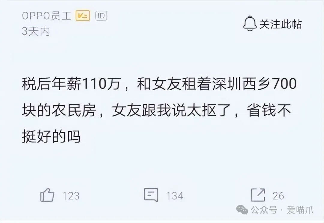 近日,一位来自国内知名手机品牌OPPO公司的员工发帖称:自己全年税前收入110万元,但是他与女友租住在深圳西乡区的一间每月仅需花费700元的农民房里,女友说他太抠了。面对如此高薪,他们却选择居住于相对简陋的农民房内,这种矛盾的消费方式一度引起热议。