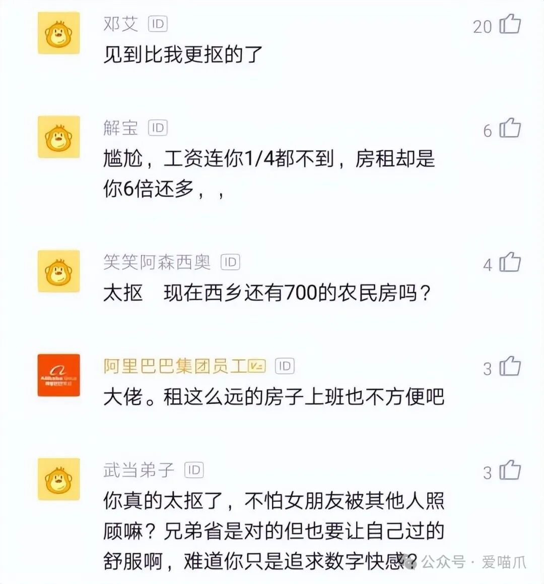 另一些网友则较为尖刻地表达了自己的观点:“你的女朋友说得没错,你只懂得赚钱,但是并不会规划生活。”还有一些网友以自身经历相较,表达了对生活品质的追求:“我最后一次居住的农民房租金也是700元,但当时我的月薪只有10400元,仅仅几个月之后便搬走了。”