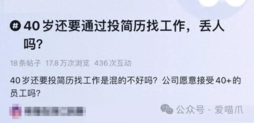最近,一条标题为"四十多岁仍需通过投简历寻找工作,丢人吗?的帖子引发了大家的关注。我们发现,该帖子仅仅在短短时间内就吸引了超过17万次浏览,以及高达436次的热烈互动。