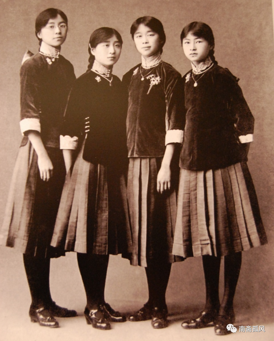 个子细长挺拔,神情端庄充满女学生的知性气质。和几位表姐站在老校舍前合影,各自散发着含蓄而娴静的芳香。