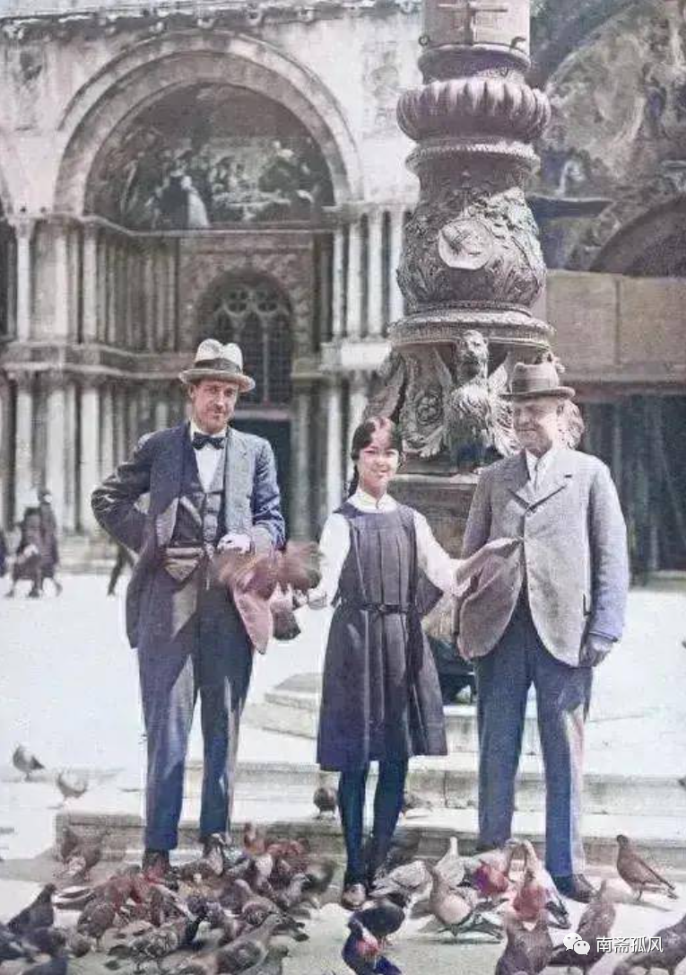 林徽因站在空旷的圣马可广场上,手中撒着面包屑,身着简约优雅的黑白套裙。