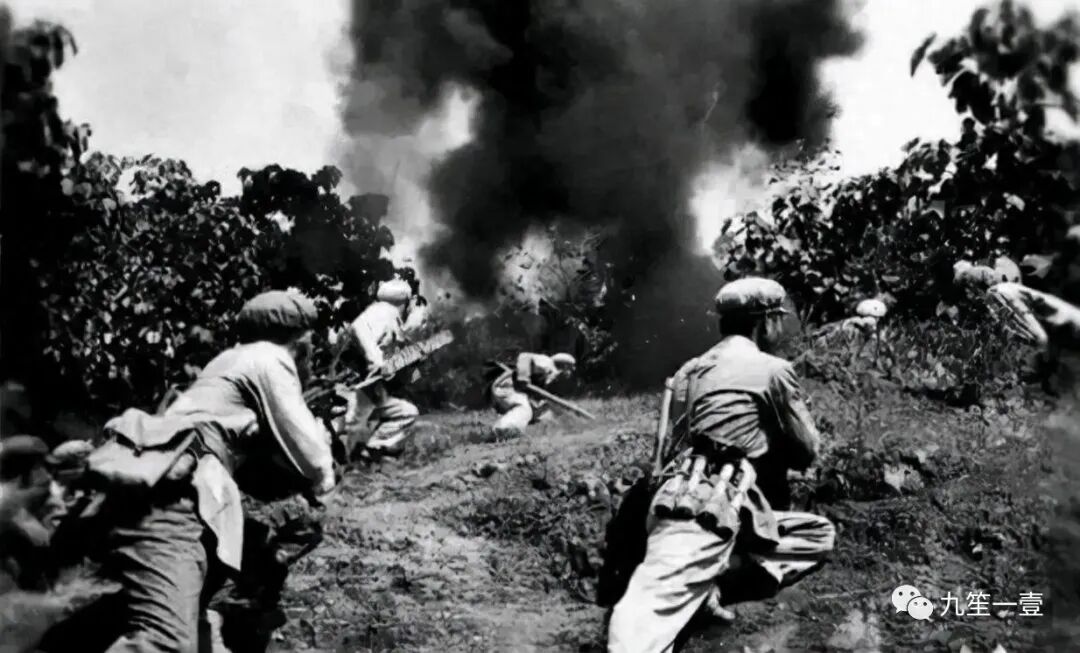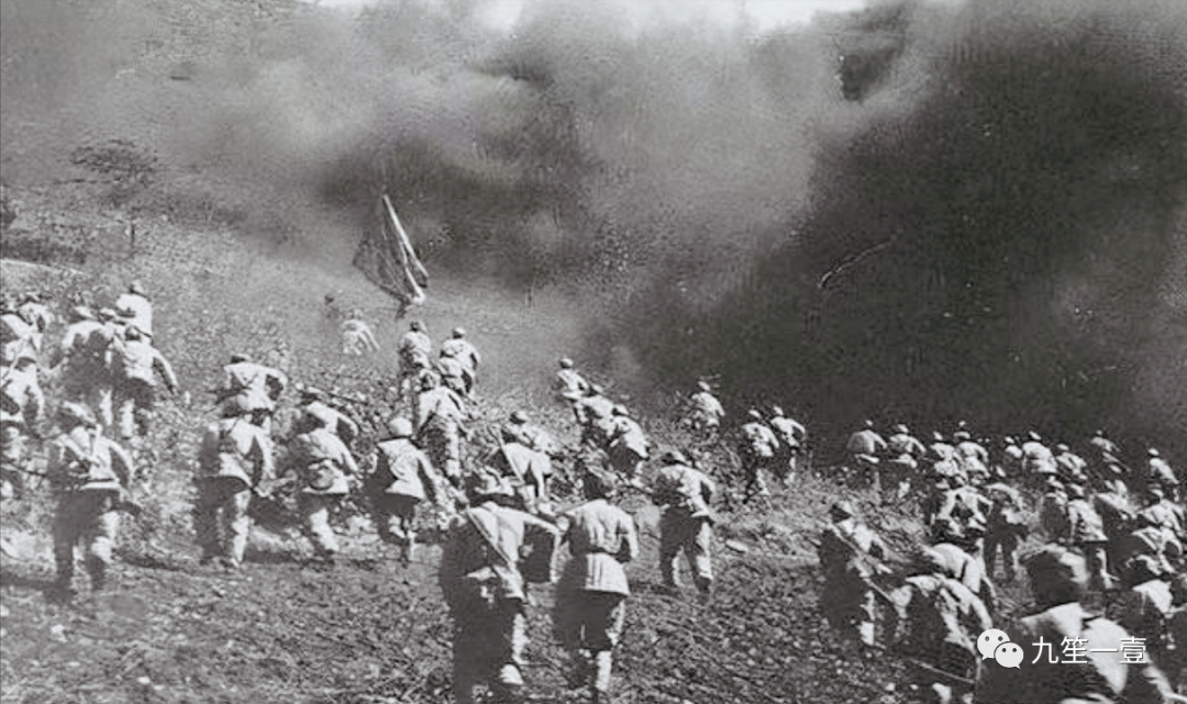 漫天硝烟里,依稀可见63军军旗,在猛烈炮火掩护下冲锋。