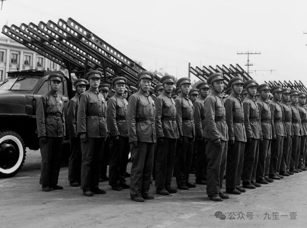 1954年国庆阅兵上,一支火箭炮方队等待检阅。