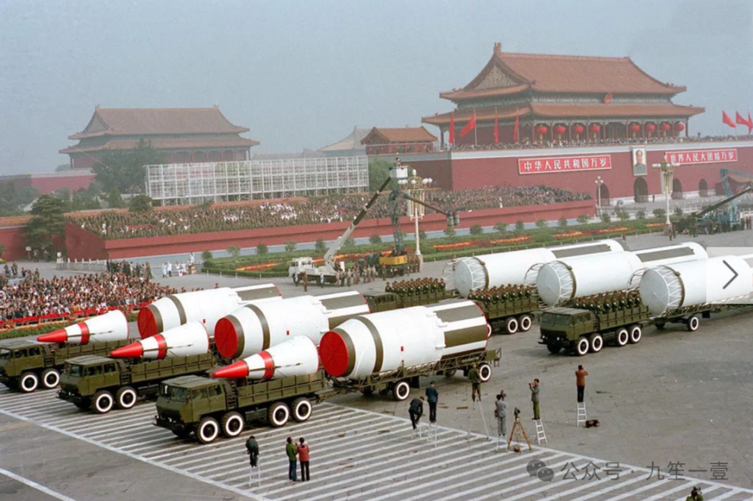 导弹从远至近缓缓驶过,分别代表着我国研制的东系列中远程和洲际导弹。