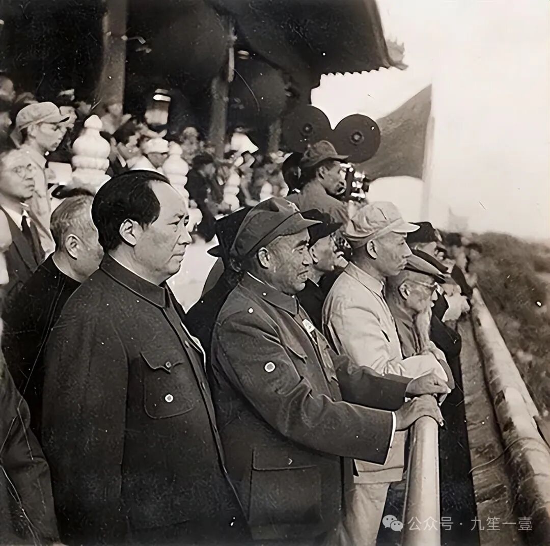 天安门之上,毛主席和来宾们身着朴素的中山装,神情严肃地聆听着国歌声。