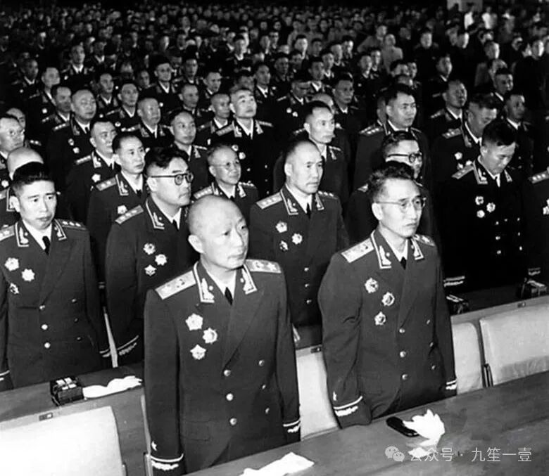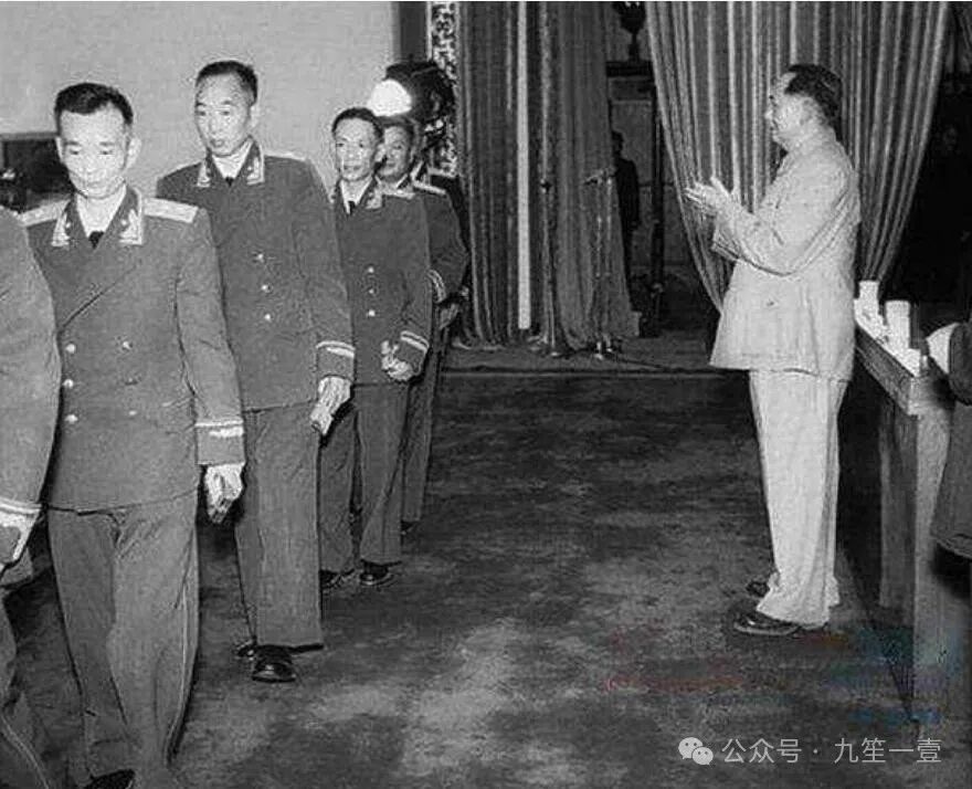 将领们身着崭新军装,胸前勋章在灯光下熠熠生辉,他们与毛主席挥手告别后,缓缓向大厅外走去。